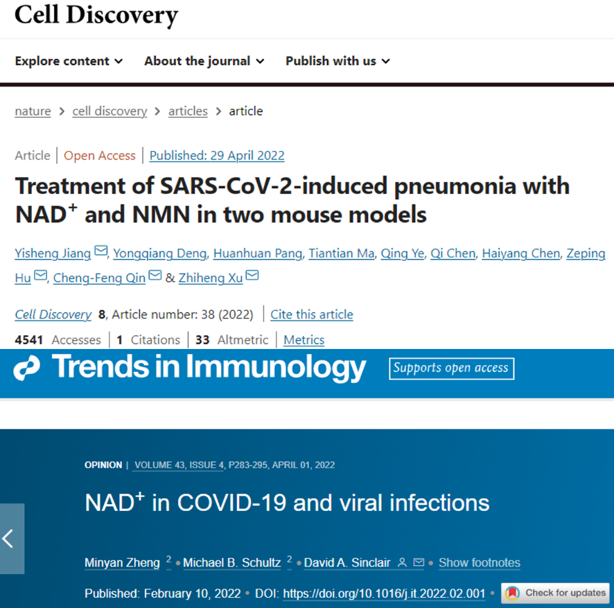 [32] Jiang, Y., Deng, Y., Pang, H., Ma, T., Ye, Q., Chen, Q., Chen, H., Hu, Z., Qin, C. F., & Xu, Z. (2022). Treatment of SARS-CoV-2-induced pneumonia with NAD+ and NMN in two mouse models. Cell discovery, 8(1), 38. https://doi.org/10.1038/s41421-022-00409-y