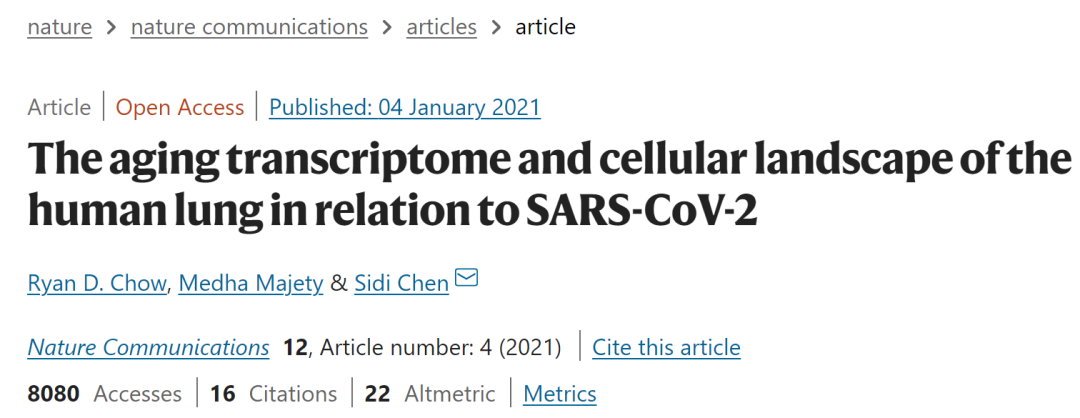 [5] Chow, R. D., Majety, M., & Chen, S. (2021). The aging transcriptome and cellular landscape of the human lung in relation to SARS-CoV-2. Nature communications, 12(1), 4. https://doi.org/10.1038/s41467-020-20323-9