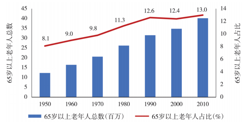 图注:1950-2010年美国65岁以上老年人数量及占比。图源[1]