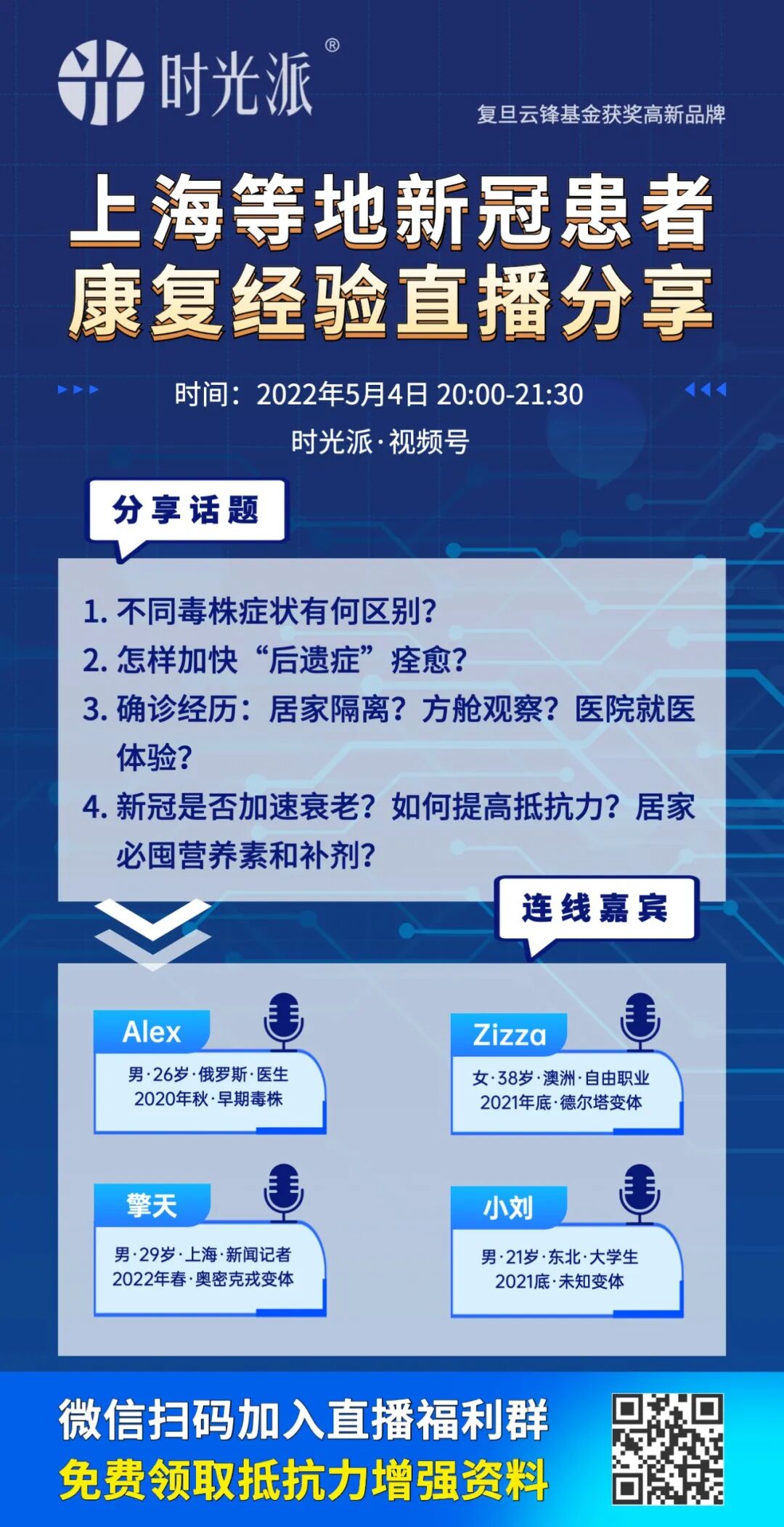 5月4日晚上20:00-21:30,时光派将主持“新冠康复者论坛”,通过4位最具代表性的新冠康复者的经历与感受,帮助大家全面、客观地了解这一疾病,在疫情中更好地保护自己。