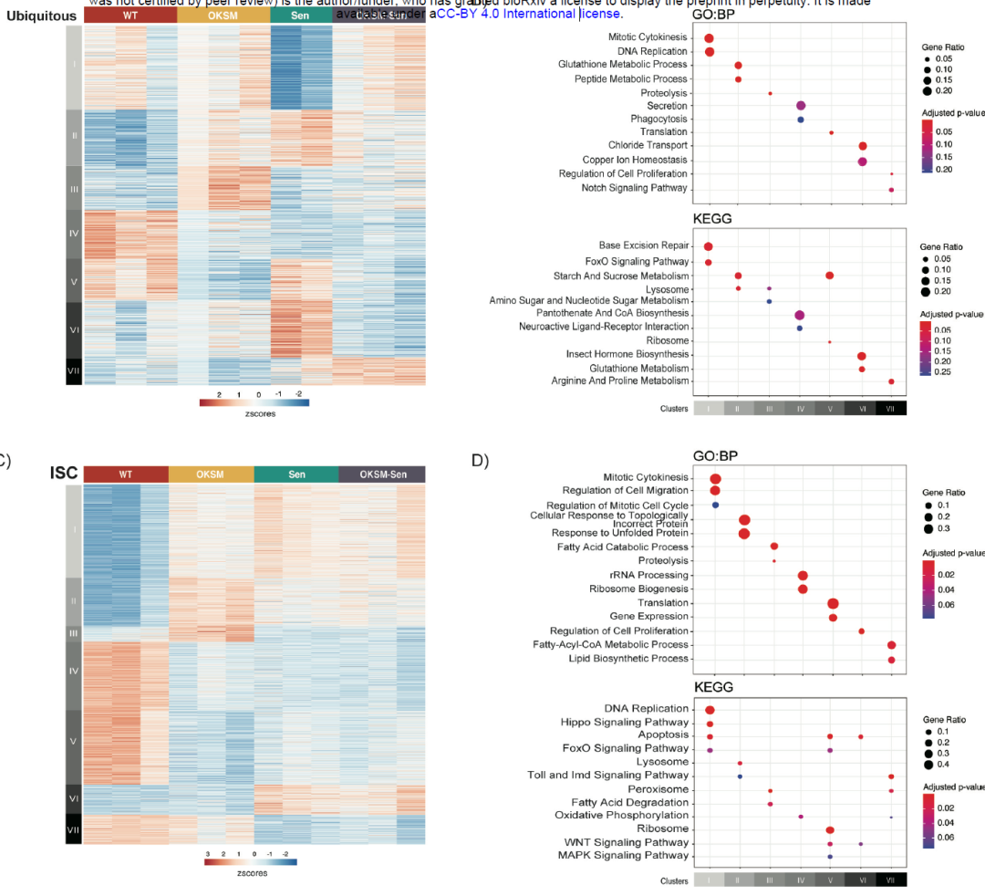 随后,进一步基因表达分析显示,相比野生型果蝇,接受重编程或衰老细胞清除的果蝇,体内与氨基酸代谢、细胞周期调控、特定发育信号通路(如细胞衰老及老龄疾病相关的WNT通路[24])相关基因出现明显改变。