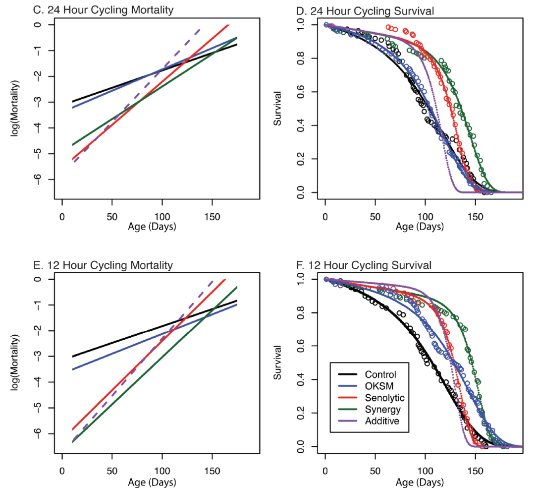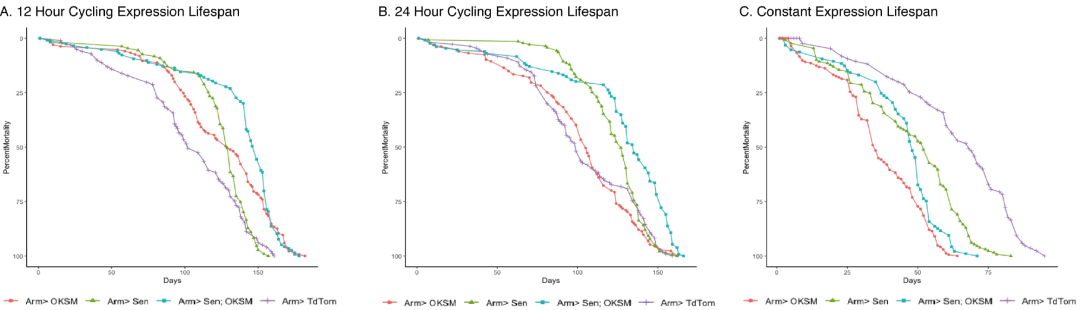 于是,研究人员们对方案进行优化,开展了“多次瞬时重编程或/和Senolytics”,并记录了不同干预措施下果蝇寿命的差异。相比持续细胞重编程与清除衰老细胞,循环多次的策略显然结果要好不少:果蝇的死亡率明显下降,寿命长度得到显著增加,其中,每周两次12小时的循环表达,效果最好。
