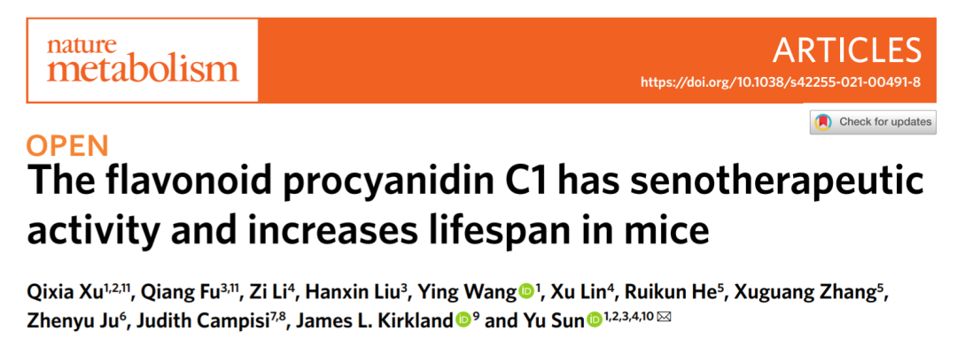 [19] Xu, Q., Fu, Q., Li, Z. et al. (2021). The flavonoid procyanidin C1 has senotherapeutic activity and increases lifespan in mice. Nature Metabolism. https://doi.org/10.1038/s42255-021-00491-8