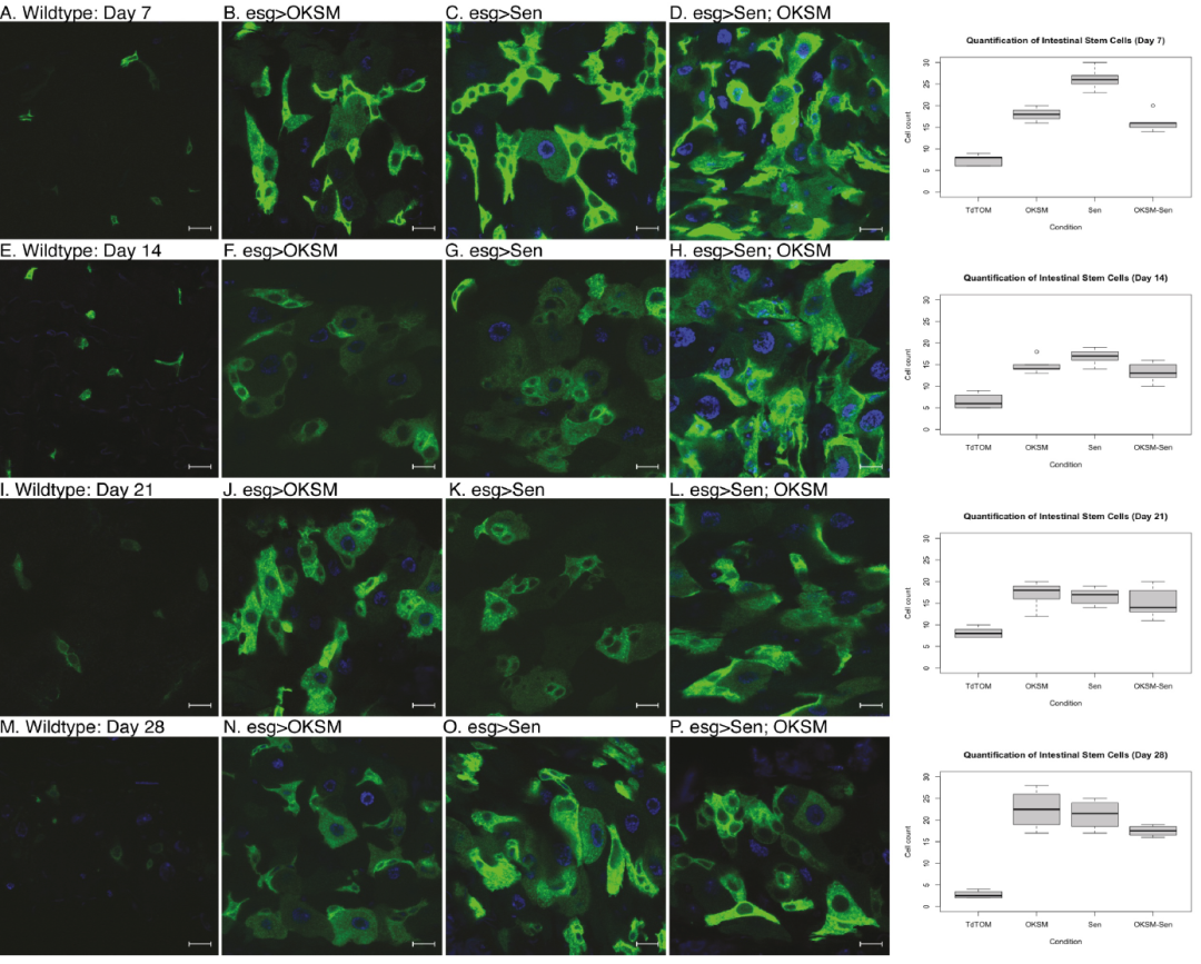 图注:重编程与衰老细胞清除在不同时间点都使得肠道干细胞增殖增加