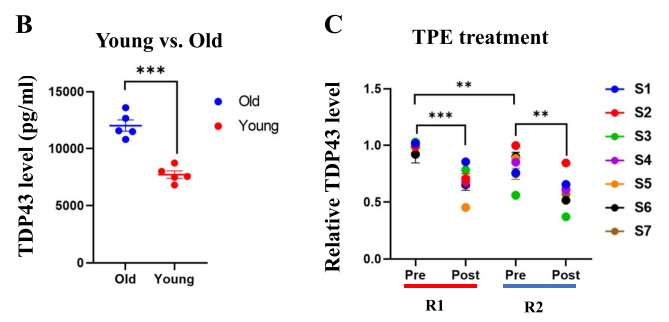 此外,研究人员们还分析了TDP43,这一随着年龄增长表达量上升,并与多种神经退行性疾病(如老年痴呆症)相关的重要标志物[6],而TPE干预能够极显著、长期降低所有受试者血液TDP43水平,即使是还未步入老年阶段的中年人,也能从中获益。