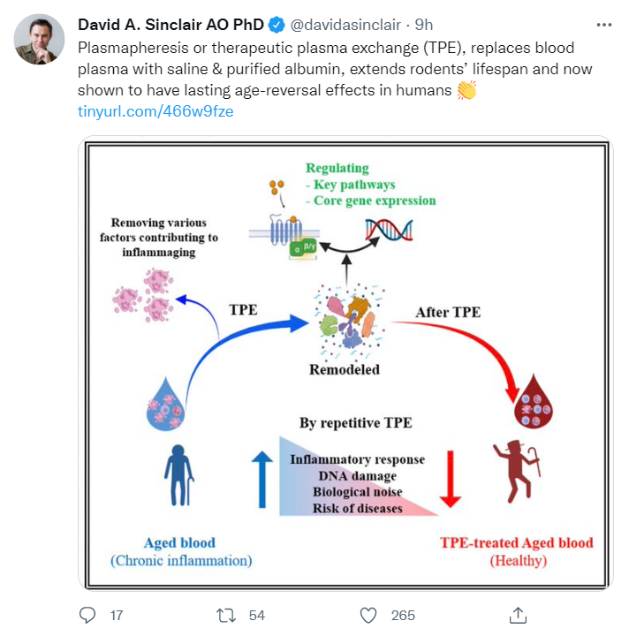 这项换血疗法的人体临床结果一经发布,便博得业内一众权威学者、媒体关注,就连有“抗衰教父”美誉的哈佛大学大卫·辛克莱教授,也在个人社交平台上不吝分享、大加赞善:TPE在人体临床中表现出持久的逆转衰老功效!