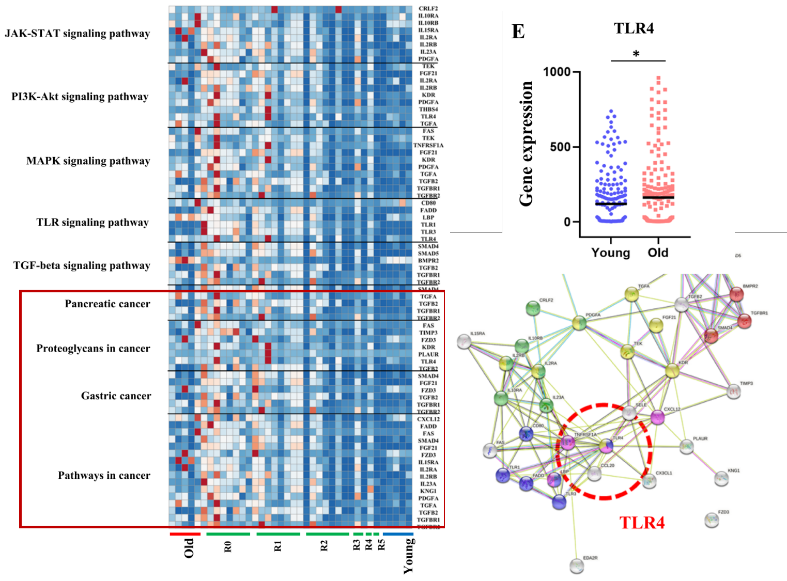 随后的信号通路网络分析揭示,随年龄增长而增加的TLR4(toll样受体4),参与了包括与免疫系统、癌症相关的多条通路,是多条基本信号通路的共有主要成分,而TPE正是通过“操盘”这一重要节点,从而调控了人体四通八达的多条信号途径。