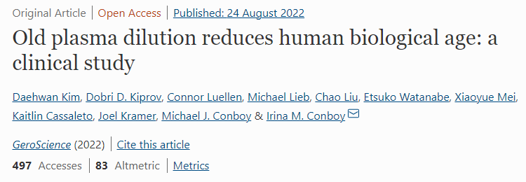 [5] Kim, D., Kiprov, D. D., Luellen, C., Lieb, M., Liu, C., Watanabe, E., Mei, X., Cassaleto, K., Kramer, J., Conboy, M. J., & Conboy, I. M. (2022). Old plasma dilution reduces human biological age: a clinical study. GeroScience. https://doi.org/10.1007/s11357-022-00645-w