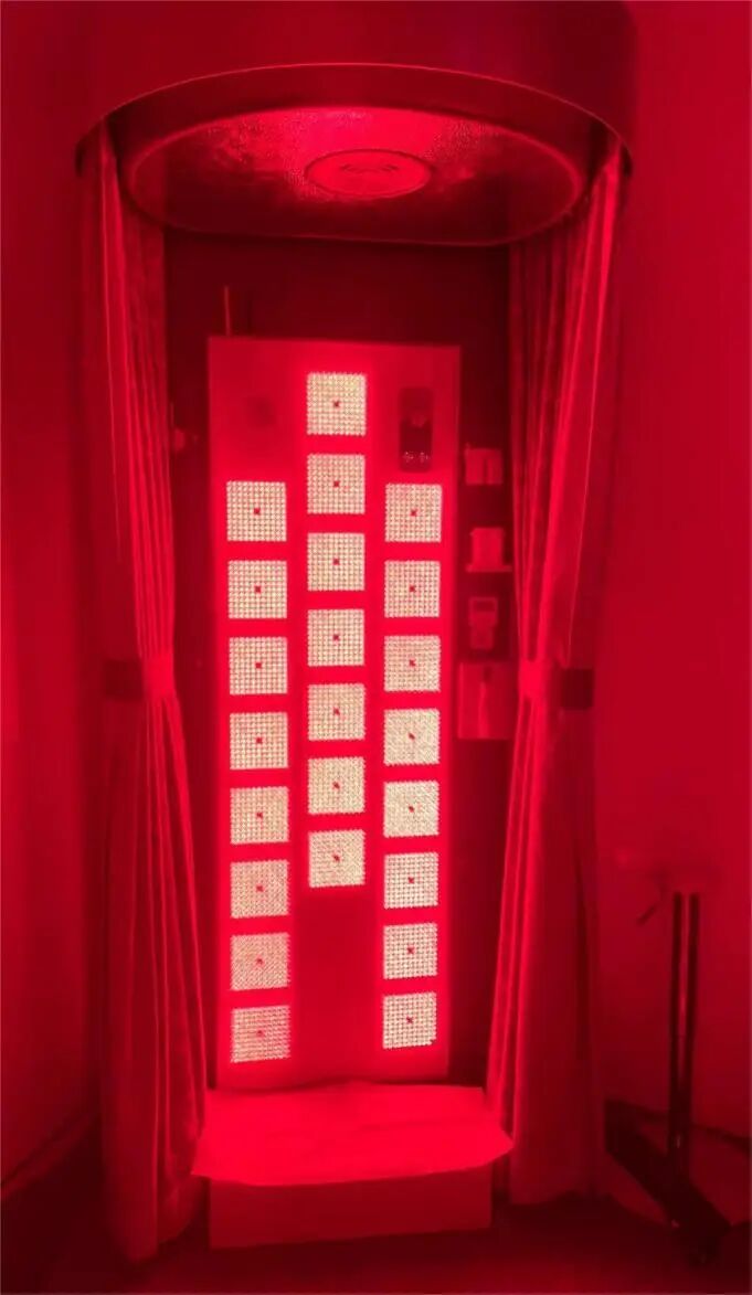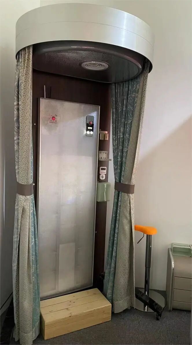 由于红光的波长辐射不会对饰品配件的材料造成任何影响[2],因此,眼镜、饰品甚至手机都是可以携带进入的。于是,腰又酸、背也疼的小编来到更衣室后,只需脱下外衣外裤身着内衣裤,就可以正式进入光疗仪器啦。(理论上是可以全部脱光的,但小编还是选择适当穿两件)