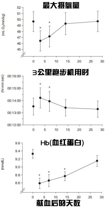 早在2015年,就有人做过这一类的临床研究,探究了19名健康人献血前后的峰值摄氧量(气)、血红蛋白(血)、3公里跑步用时(综合)等指标,发现大多数指标都在1个月内恢复到了献血前的水平[9]。