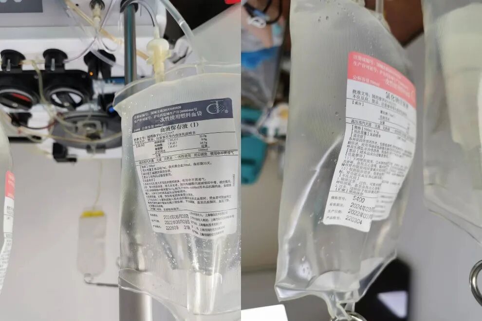 图注:献成分血时第一遍血细胞混合液(左,抗凝剂+葡萄糖)和第二遍血细胞混合液(右,生理盐水)
