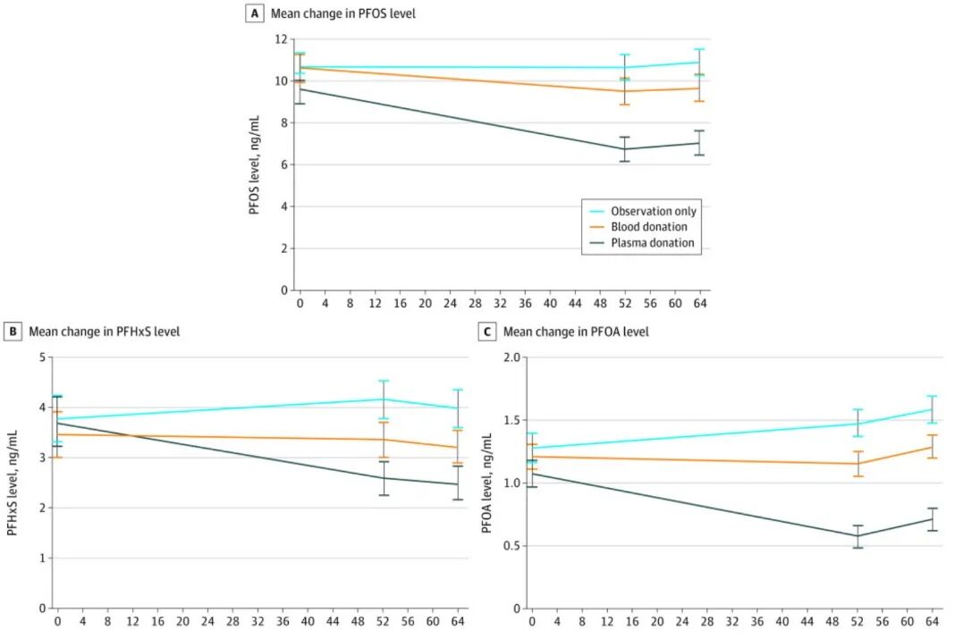 但是!献血可以让你松一口气呀!在这项为期1年的临床试验中,每12周献一次全血的受试者能清掉身体里1/5的PFAS,而每6周献一次成分血的受试者直接可以清掉一半以上的PFAS!
