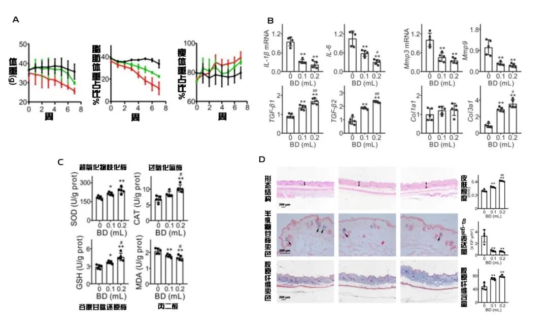 图注:A.脂肪堆积减少B.SASP表达下降C.氧化应激减少D.皮肤老化缓解