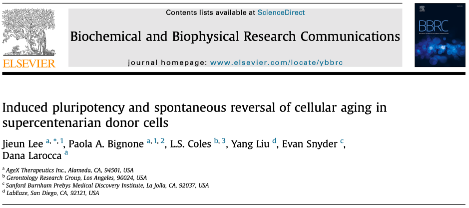 [1]. Lee, Jieun, et al. “Induced Pluripotency and Spontaneous Reversal of Cellular Aging in Supercentenarian Donor Cells.” Biochemical and Biophysical Research Communications, 2020, doi:10.1016/j.bbrc.2020.02.092.