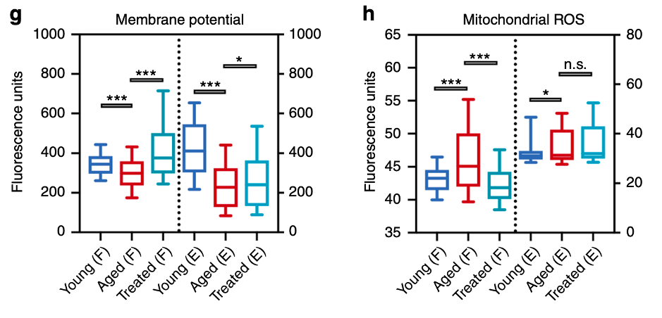 细胞中的线粒体膜电位(左)和线粒体活性氧(右)有显著改善。