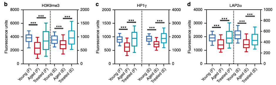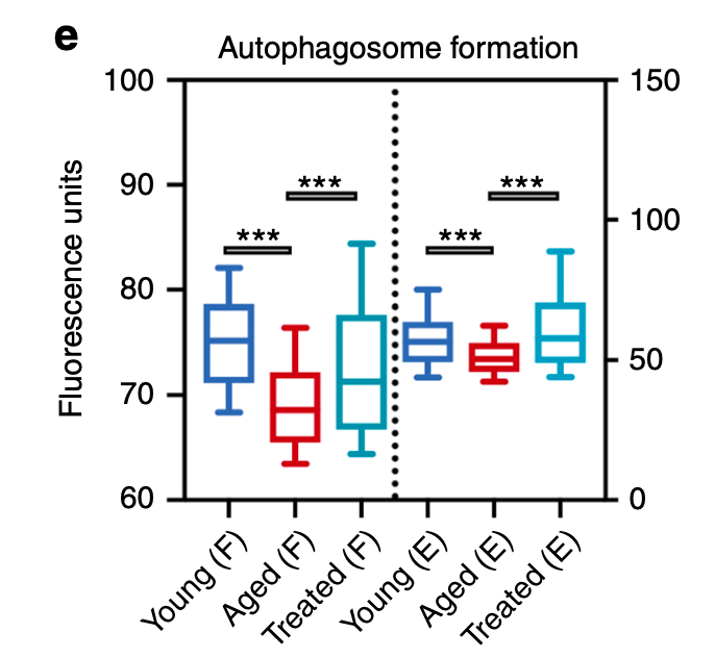 除此之外,表观遗传抑制标识H3K9me3水平,吞噬体生成(autophagosomes formation),糜蛋白酶样蛋白酶体活性(Chymotrypsin-like proteasomal activity)和细胞因子水平等多项会受到衰老影响的生理指标都被恢复至了年轻水平。