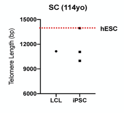 三个超级百岁老人的iPSCs中,只有一个的端粒长度被成功延长
