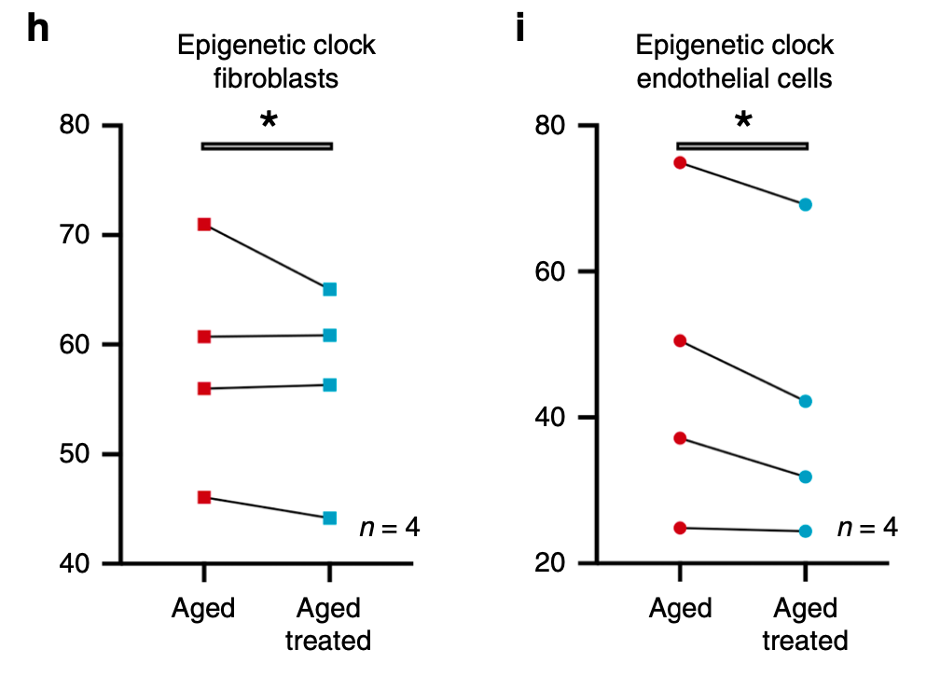 老年人类的纤维母细胞(左)和内皮细胞(右)中表观遗传时钟表现出明显的年轻化。