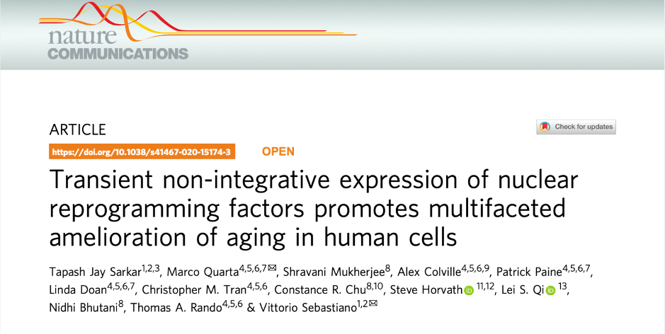 [2]. Sarkar, Tapash Jay, et al. “Transient Non-Integrative Expression of Nuclear Reprogramming Factors Promotes Multifaceted Amelioration of Aging in Human Cells.” Nature Communications, vol. 11, no. 1, 2020, doi:10.1038/s41467-020-15174-3.