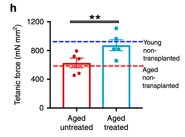 在这种不完全重编程对细胞衰老的改善功效得到了足够的数据支撑后,研究人员开始探索这一技术在医学应用的上的可能性。通过将衰老的小鼠肌肉干细胞进行不完全重编程,并将其植入患有肌少症的老年小鼠体内,发现小鼠的肌肉力量显著增强,近乎恢复至年轻小鼠水平。