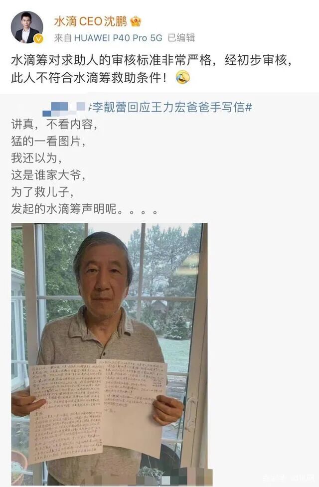 搞得水滴筹CEO沈鹏也亲自下场回应,五味杂陈:经初步审核,此人不符合水滴筹救助条件: