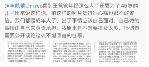 而李靓蕾则快狠准地对此回应道:你儿子自己都是45岁、三个孩子的爹了,还要你们给他擦屁股,这是有多不堪?