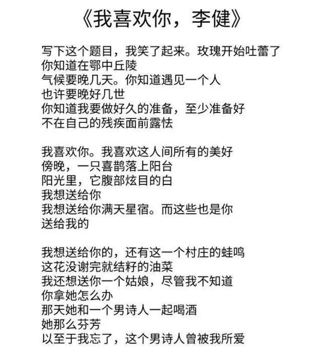 这4首情诗分别是:《我喜欢你,李健》、《远方的你》、《我们何以爱这荒唐的人世》、《我要拄着拐杖去和你相爱》,这里把《我喜欢你,李健》这首贴出来大家看一看: