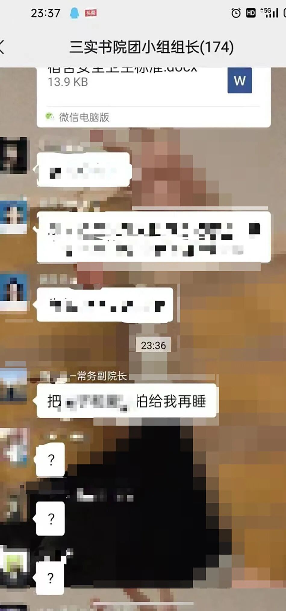 前因后果是这样子的:该学院工作群里,一位女辅导员安排工作,通知学生检查发现大量不合格宿舍,要求按学校标准进行打扫。