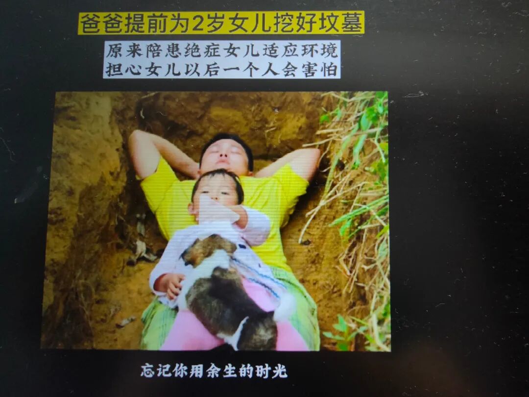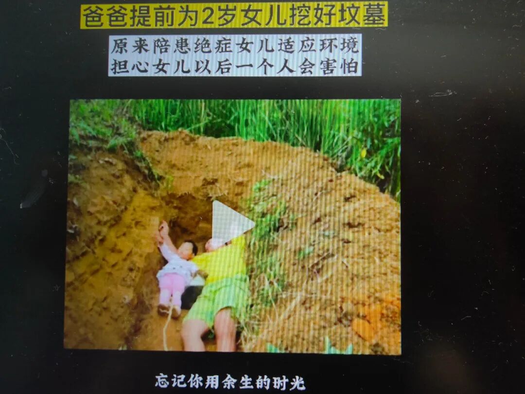 这位年轻的爸爸,因为女儿身患绝症,为了给孩子治疗已经花光家里的积蓄,如今无力医治之下只得带着孩子回家静等命运的最终判决,由于担心女儿以后一个人会害怕恐惧,无奈的爸爸提前挖好坟墓,并经常陪伴女儿在里边玩耍,以提前适应命运的安排。