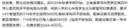 云南普洱市张先生通过国务院“互联网+督查”平台反映,思茅区第四中学以是否购买平板电脑划分智慧班和传统班,智慧班的学生需要花5800元购买平板电脑。