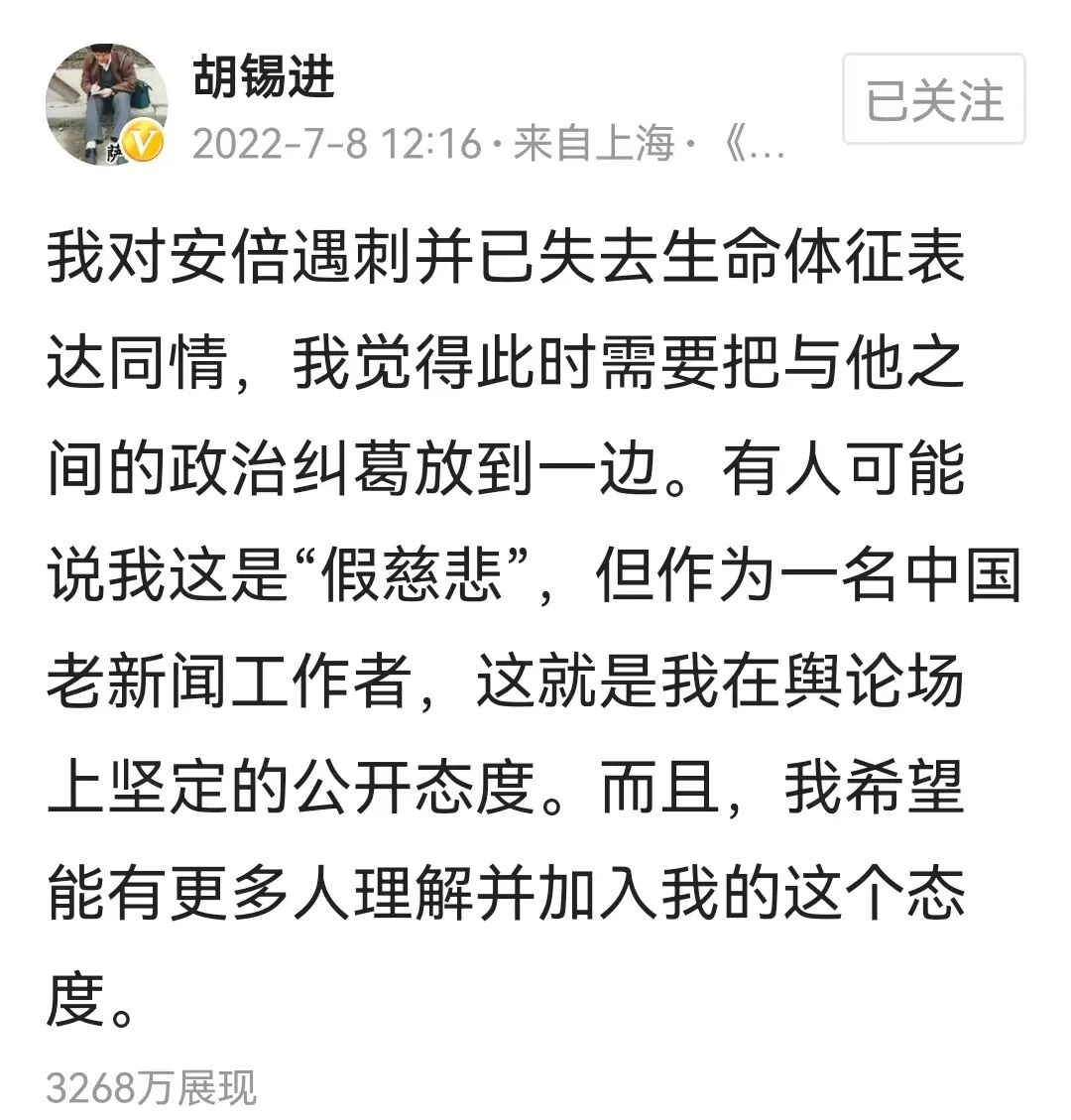 当然,胡总编表达他的同情,是他的站位与立场,也是他的权利,但是似乎也不应该让所有人都跟着他一起同情,因为安倍不是一个普通老人,而是一个干尽损害中华民族情感与利益的政客。