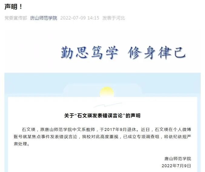 关键是,她吃谁的饭,端谁的碗?唐山师范学院马上意识到问题的严重性,发布声明绝不会放任这样的言论继续在网上发酵。