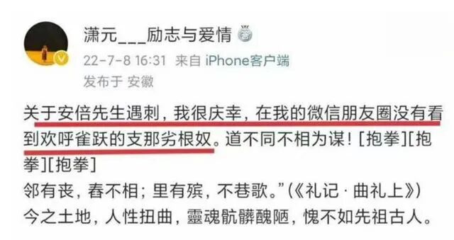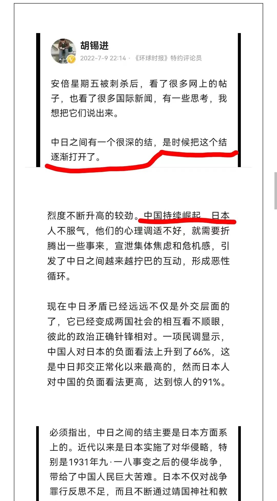 还有,昨天环球时报的前总编总胡发完那条“同情”安倍的博文后,面对澎湃的民意,他总算意识到调子唱歪了,赶紧又发了篇博文,这回语气变了: