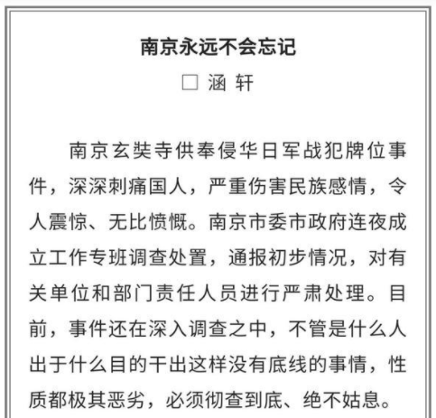 7月23日凌晨1时31分,“南京发布”发布文章《南京永远不会忘记》,表达了南京的严正立场。