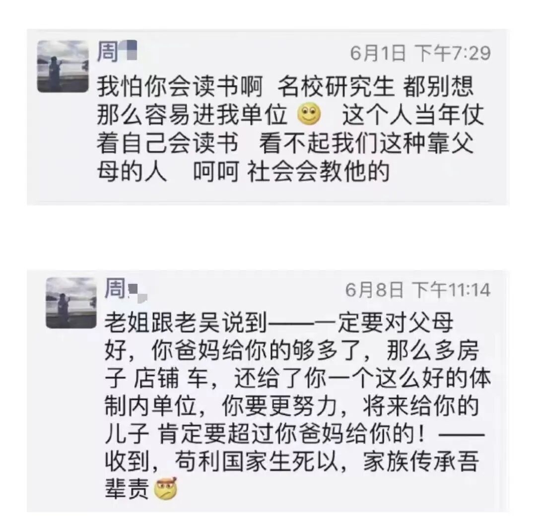 比如他家里的6套不动产是真的,他父母及他在朋友圈提到的亲属(大伯,三伯)确实是体制内的离任领导,不是什么纯白丁,比如他嘲笑会读书的孩子怎么也拼不过他这种背后有资源的孩子,说他的单位名校研究生都别想轻易进入,他说的这些话,句句是血淋淋的现实。