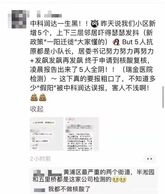 还有据《第一财经》报道,今年4月30日,上海市滨江壹号院小区的部分居民因检测结果呈阳性向记者求助,表示自己怀疑核酸检测数据的准确性,果然在复核后结果是阴性。