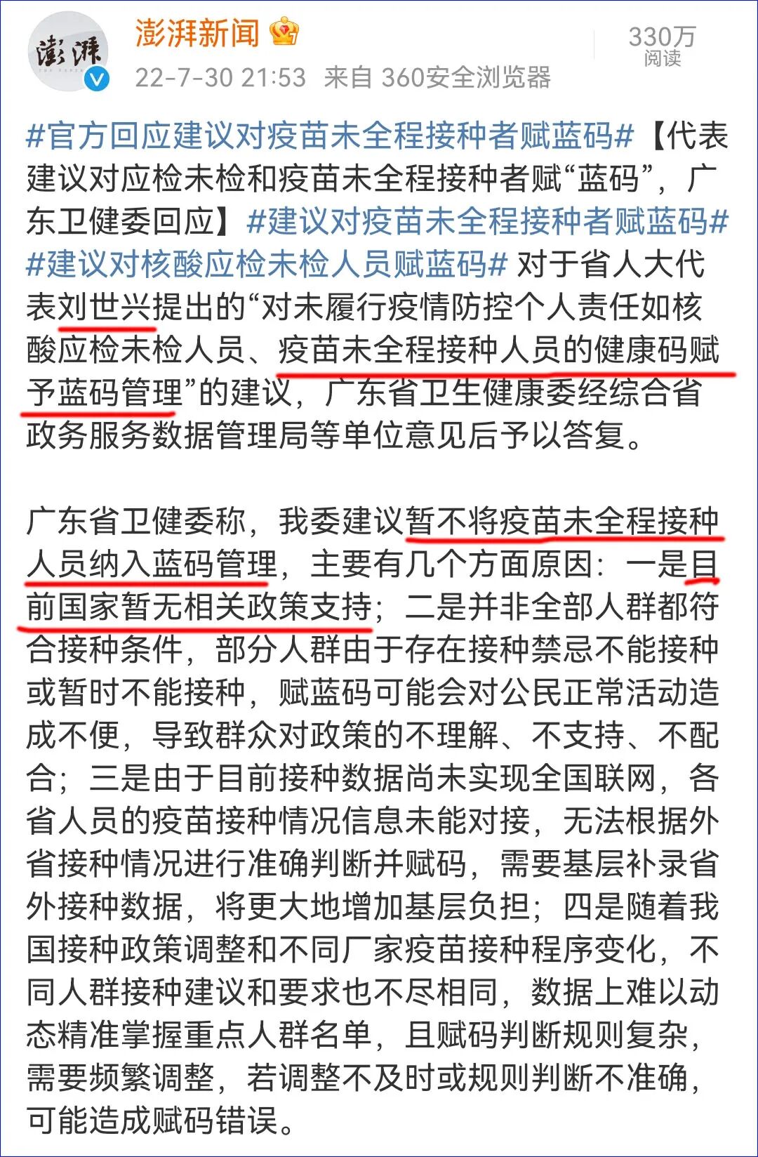 还有个叫刘世兴的人大代表,广东的,他提了一个建议,说要将“疫苗未全程接种人员的健康码赋予蓝码管理”。
