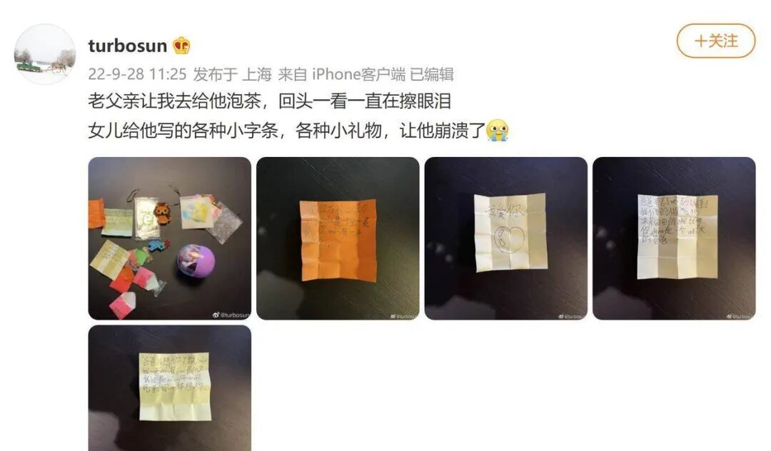 “老父亲让我给他泡茶,回头一看,一直在擦眼泪。女儿给他写的各种小字条,各种小礼物,让他崩溃了。“