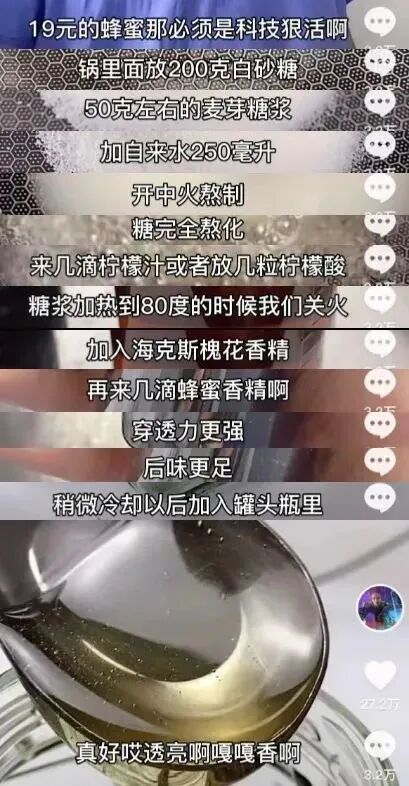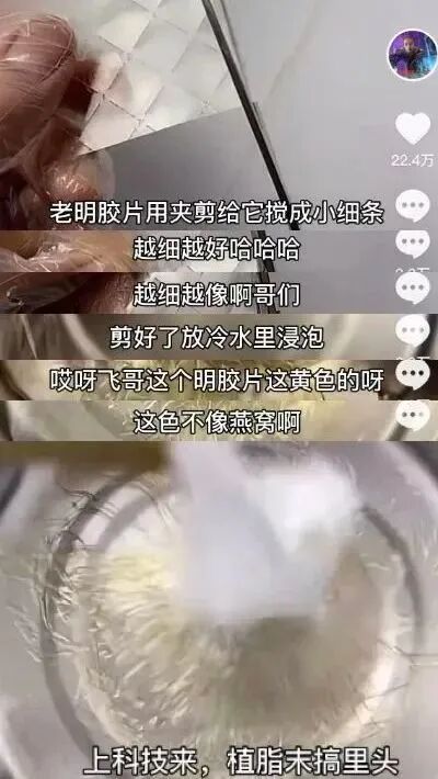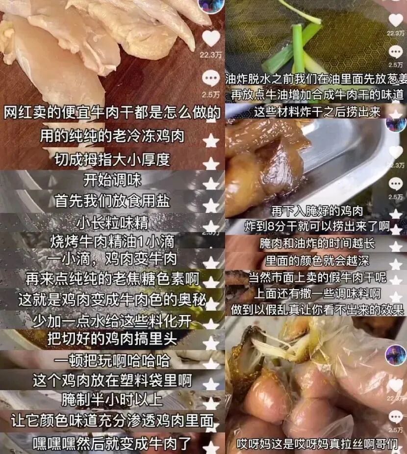 辛吉飞因为“科技与狠活”出圈,他对美食黑幕一次又一次的揭露,让很多人知道了合成牛肉、科技淀粉肠、没有奶的奶茶,白砂糖做成的蜂蜜,明胶片做出来的低价燕窝等等的制作过程: