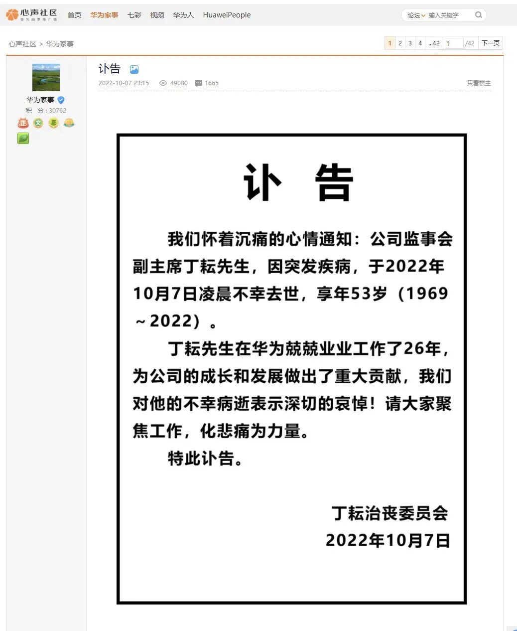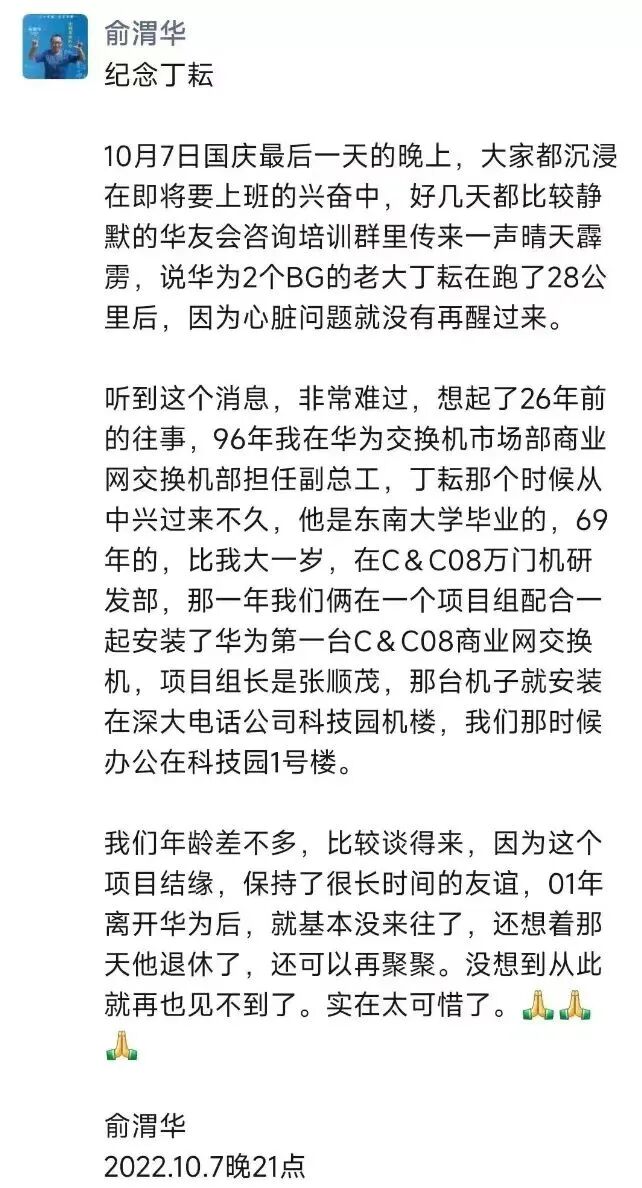 华为核心高管丁耘突发疾病,于10月7日凌晨不幸去世,年仅53岁。