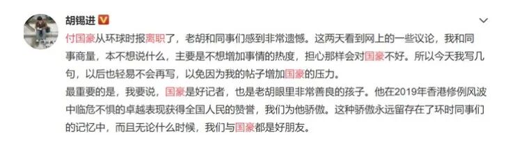 其父在2021年4月更发文指,由于收入及经济状况难在北京有安身之所,付国豪选择离开《环时》。