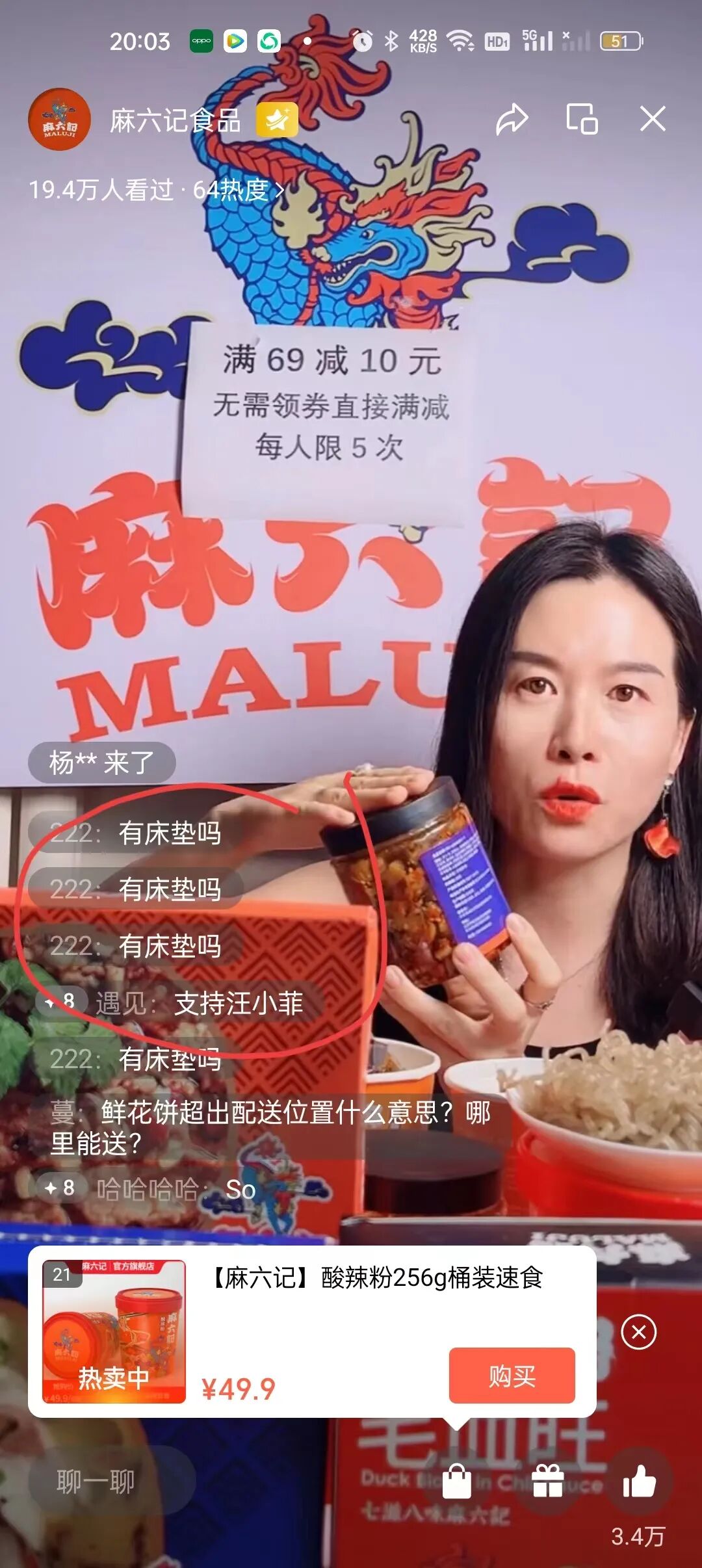 昨天麻六记食品旗下在微信视频号的直播间流量截止到晚上20点,快破20w场观,那还不是张兰和汪小菲亲自上场直播,若是他们母子俩亲自直播,还不得破百万哪。