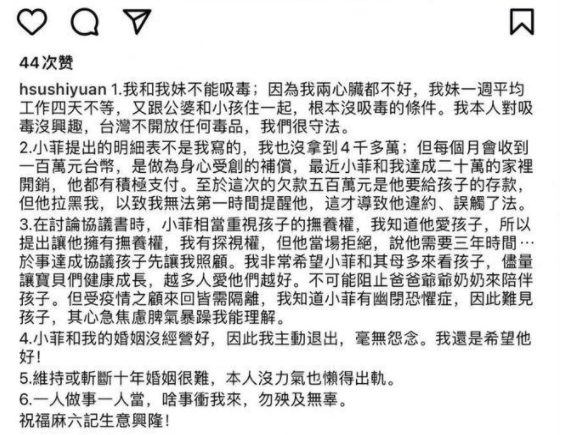 大S也应战发文,说:我没出轨,我和小s也没吸毒,我心脏不好怎么可能吸那玩意儿?