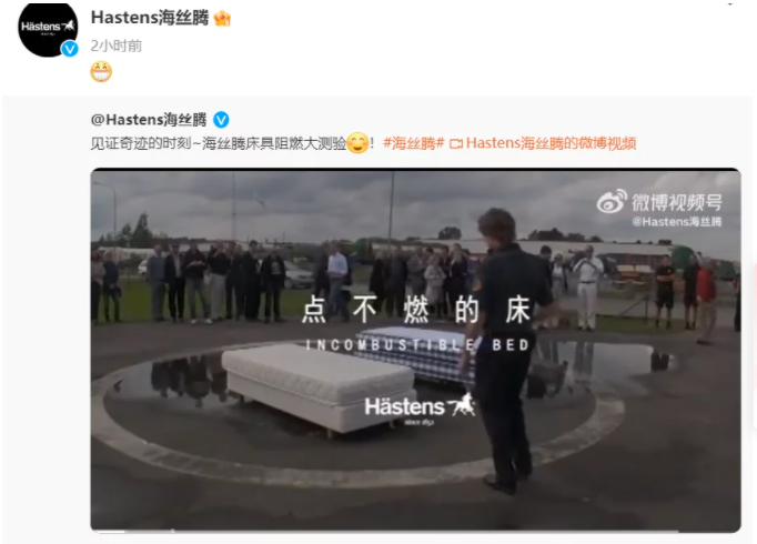 连床垫的品牌方海丝腾也看不下去了,赶紧下场发布视频表示,咱家的床垫具有阻燃功能,是烧不着的!