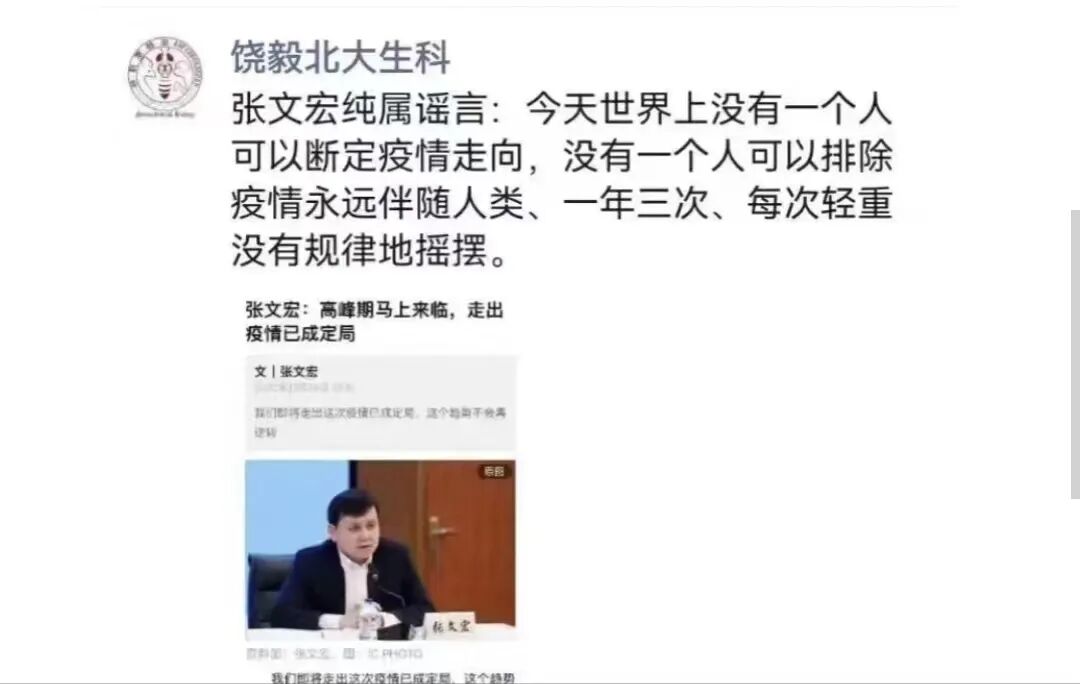 饶毅公开说张文宏的话是谣言。因为张文宏说高潮期马上来临,走出疫情已成定局。