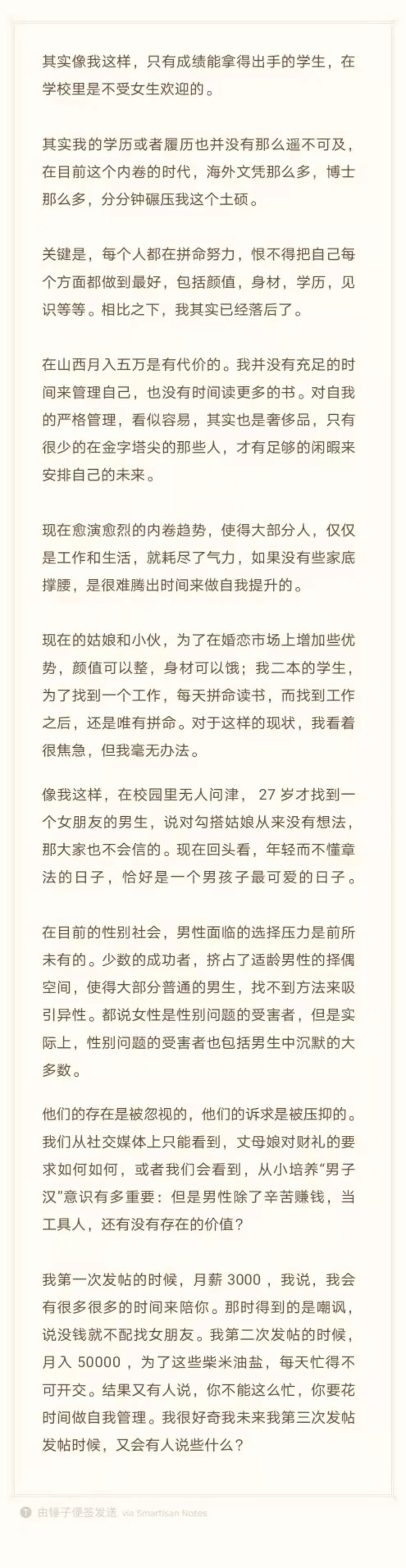 但是他把找不到老婆全然归结为社会内卷化,归结为少数成功男性挤占了普通男性的选择空间,归结为丈母娘要彩礼高,我不太认同。