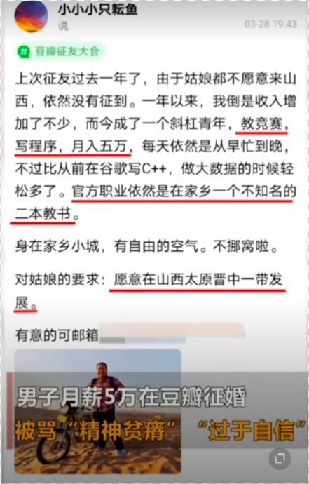 实际上早在一年前他就因为网上征婚被群嘲“不配找女朋友”。