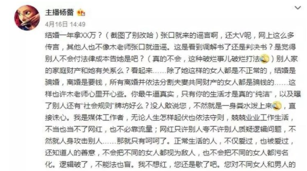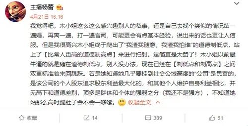 杨蕾也公开回怼木子美,贬她半生都只知道瘫在道德制低点扫射别人,一副我渣我随意,我渣我怕谁的样子,事实上被别人白睡了还非要显得自己有多高尚。
