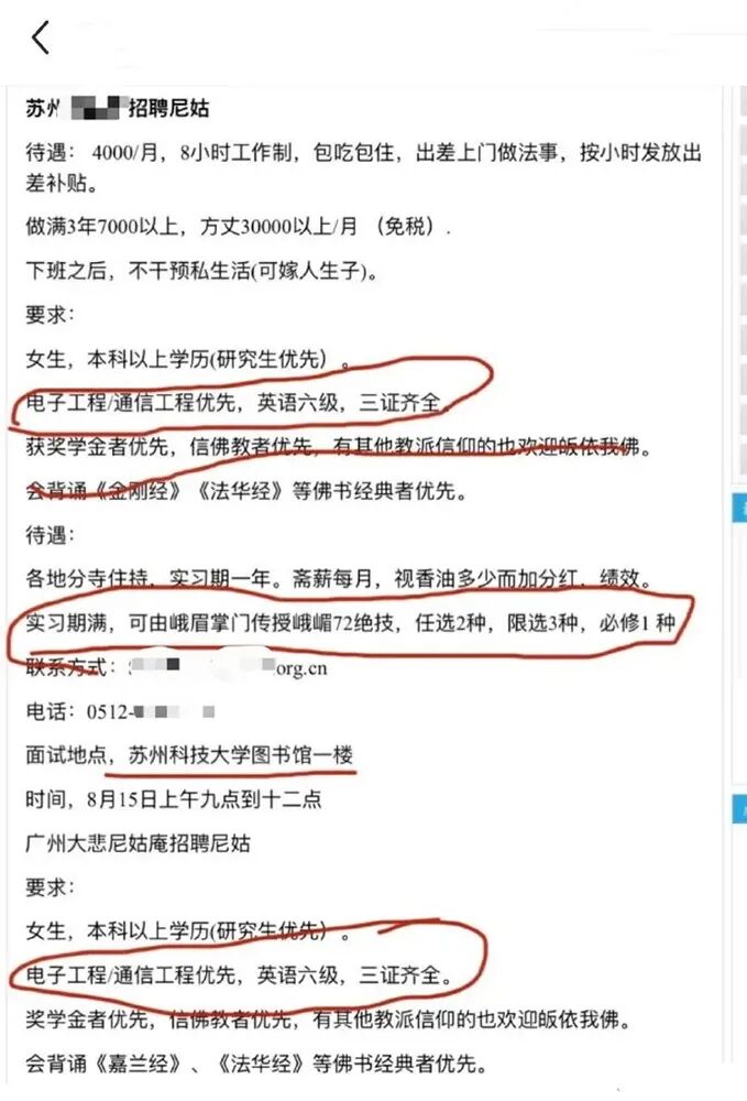 只是没想到,假尼姑比真尼姑的条件与门槛更高,学历这道关首先把俺们拒之门外了,看看这条网传的苏州某寺的尼姑招聘启示,明明白白写着“研究生优先”!还有专业限制,且英语需过六级,获得过奖学金者优先!