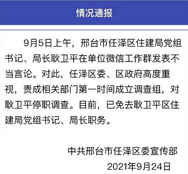 前几天因为发在工作群里这句“明天做一回吧,不戴套了”而火上热搜的邢台市任泽区住建局党组书记、局长耿卫平,组织上对他的处理结果来了。